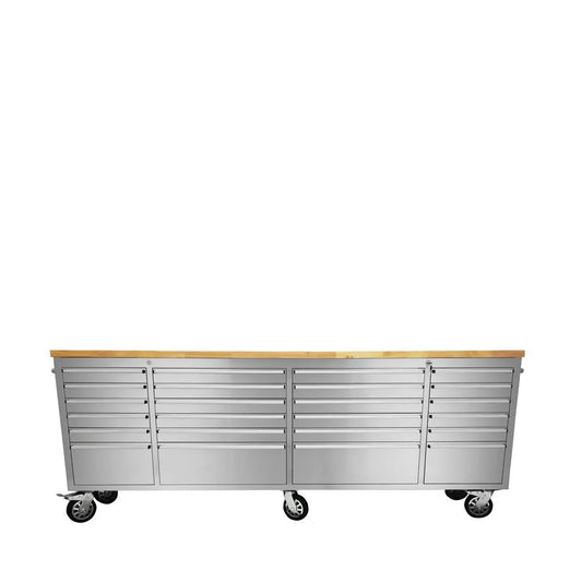 96" Stainless Steel Rolling Workbench, Rubberwood Tabletop, 24 Lockable Drawers, Locking Wheels, TMG-WB9624S