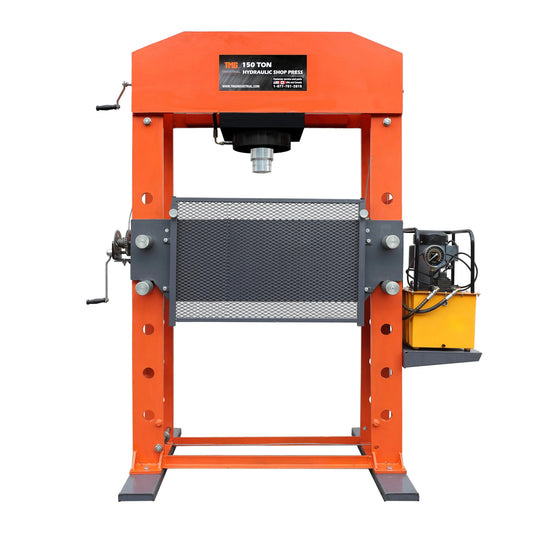 150 Ton Capacity Electric Hydraulic Shop Press, Heavy Duty Pressing, Protective Grid Guard, Fully Welded H-Frame, TMG-SP150