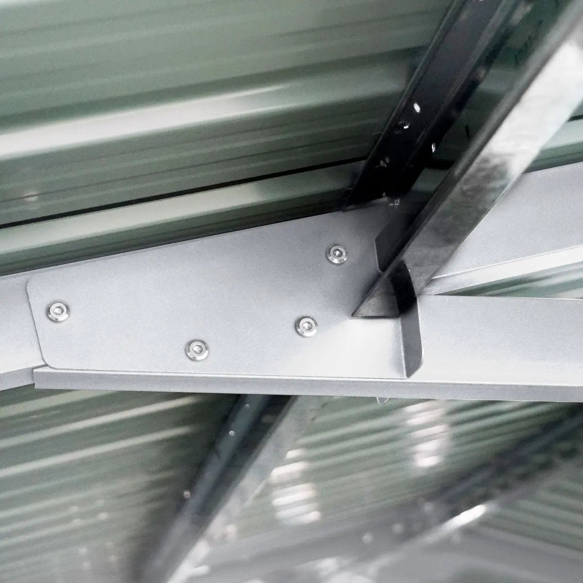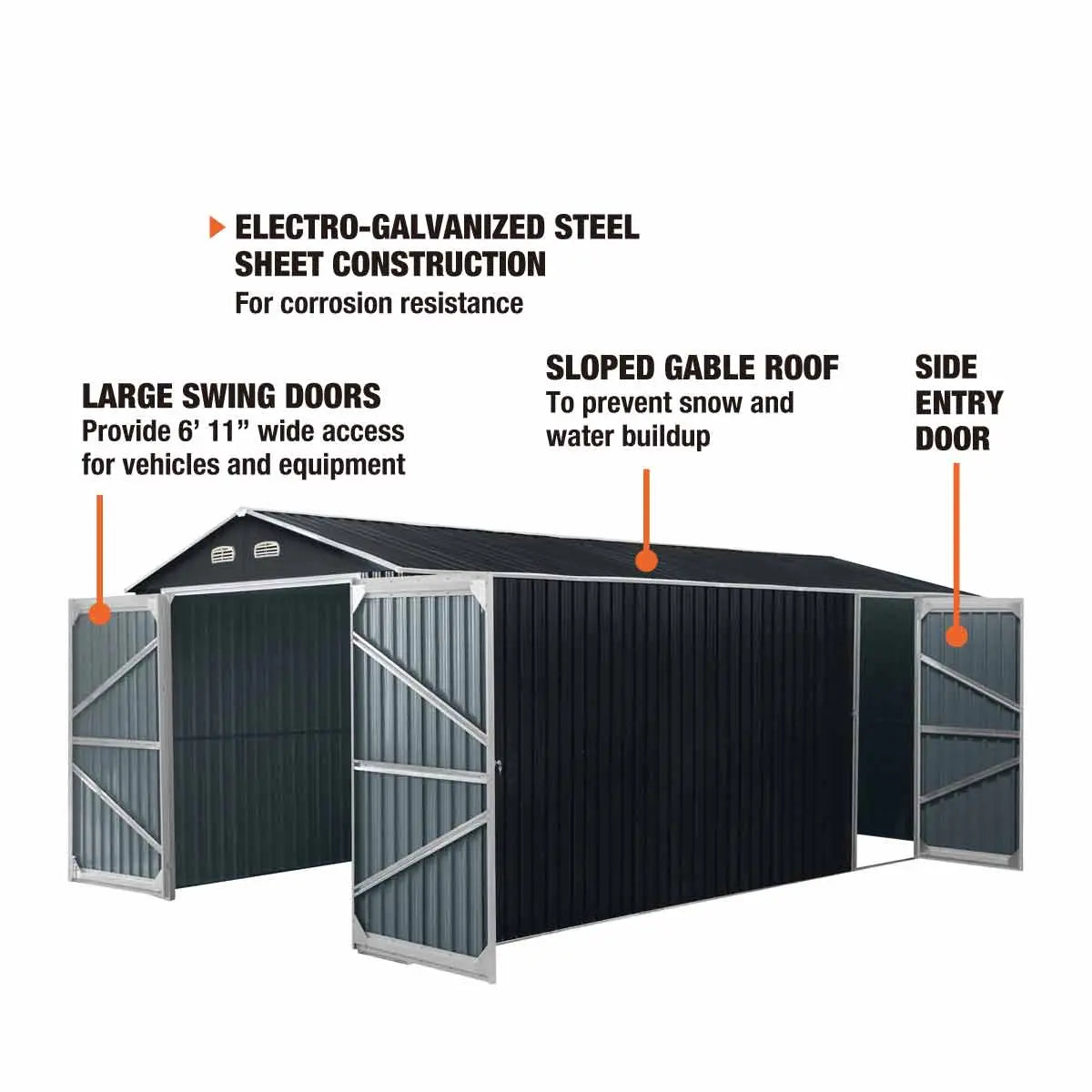 Our metal garage has reinforced roof supports, wall bracings and anchors making it a dependable structure for the housing of all your valuable goods. It's built to last and capable of accommodating your needs with approximately 185 sq-ft of floor space that could be used as a covered outdoors woodworking or mechanic's shop. Fitted with electro-galvanized steel sheets and polyester paint that offer protective resistance against corrosion, rust and wear. Stockpile extra lumber, piping, motorized machinery and power tools; anything you need to help get the job done.