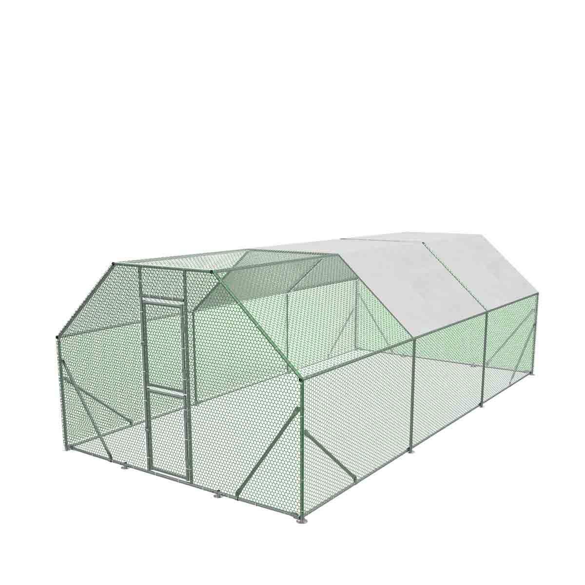 A weather-resistant polyethylene (PE) tarp covers one side of the enclosure to provide shade and rain protection. The spacious design gives occupants plenty of room to run, jump, perch and mingle amongst each other. Sturdy and secure lockable steel gate provides easy in/out access, and the quick put-together, slip-fit tube connections with pre-drilled footplates are easy to assemble and will have this coop up and operating in no time.