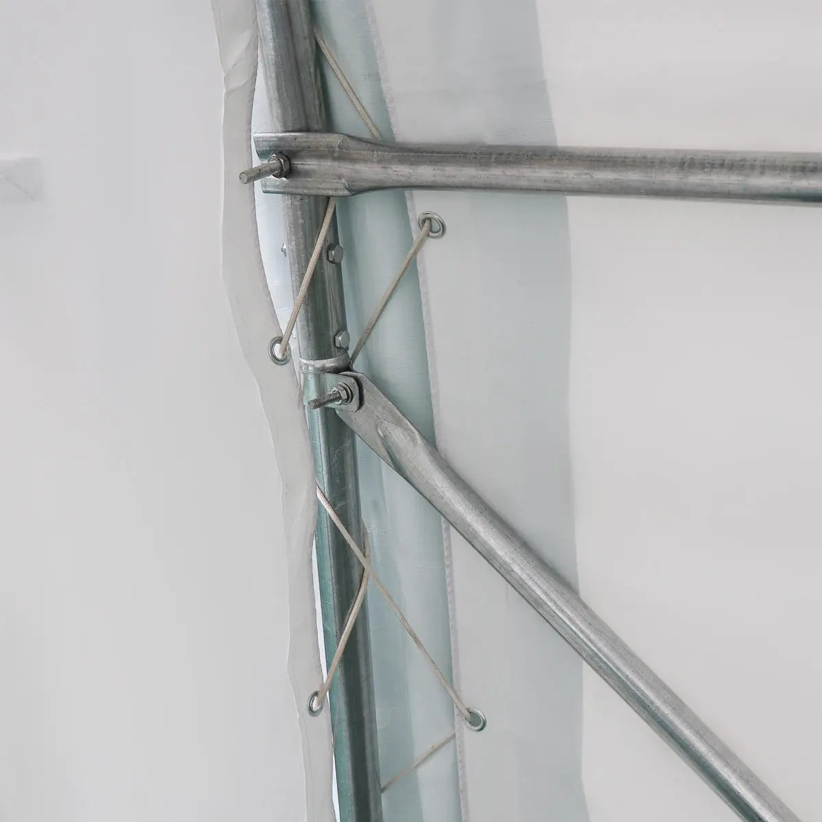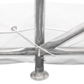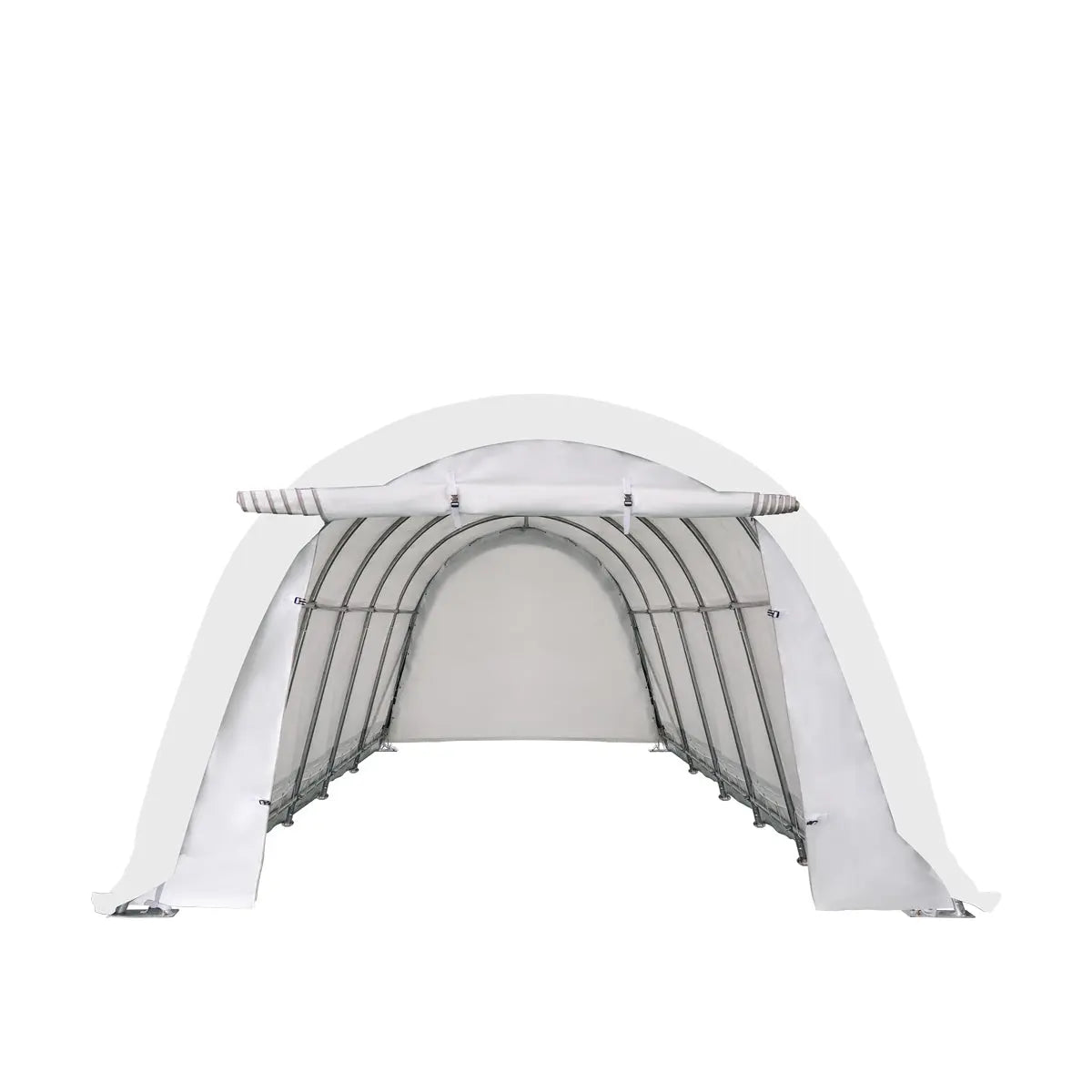 Commercial grade 3-layer galvanized steel frame structure is heavy-duty and built to last with an anchor bolt system that has been integrated to easily secure ground bars to the footplates for a sturdy, reliable footing. Dirt skirts along both sides also help to prevent crosswinds from kicking up under the shelter.