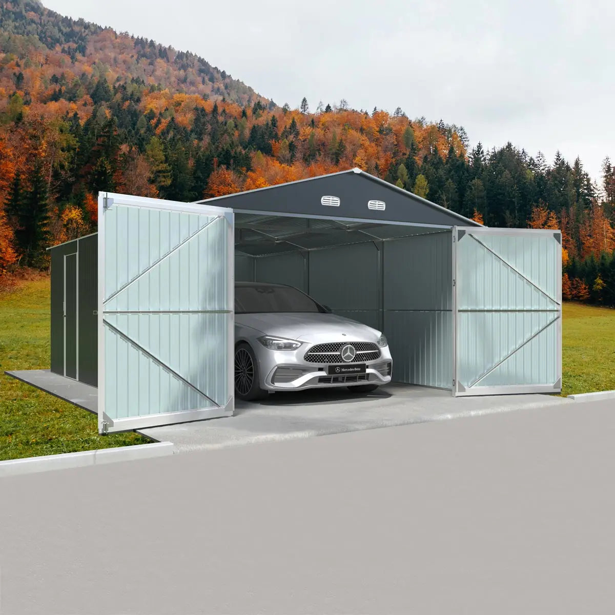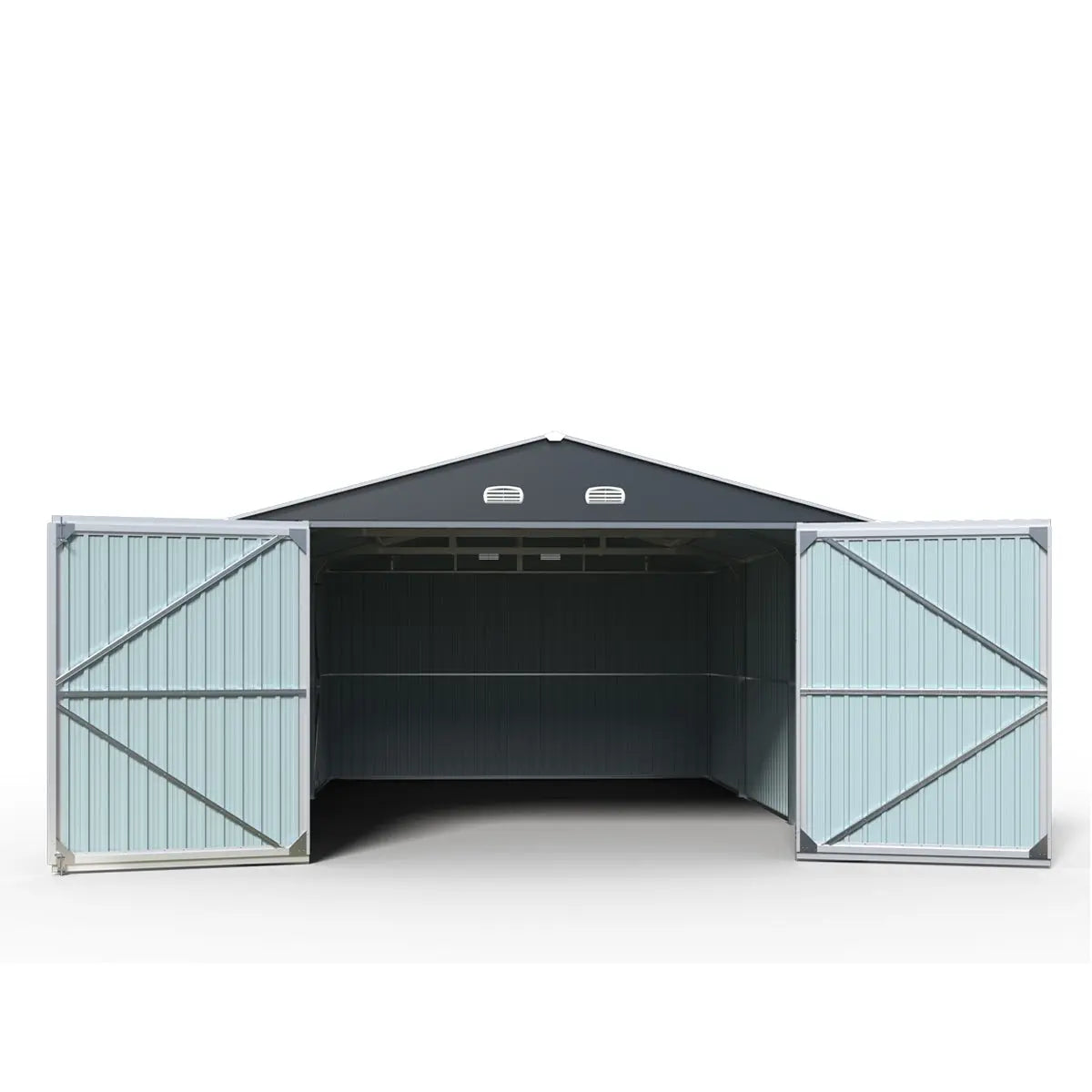The TMG-MS1320A Metal Garage Shed with Double Front Doors is a heavy duty, spacious, robust steel structure that can be used as a garage, workshop or storage building. Fully enclosed for year round protection of your boat, RV, pickup, off-road vehicles and farm equipment.