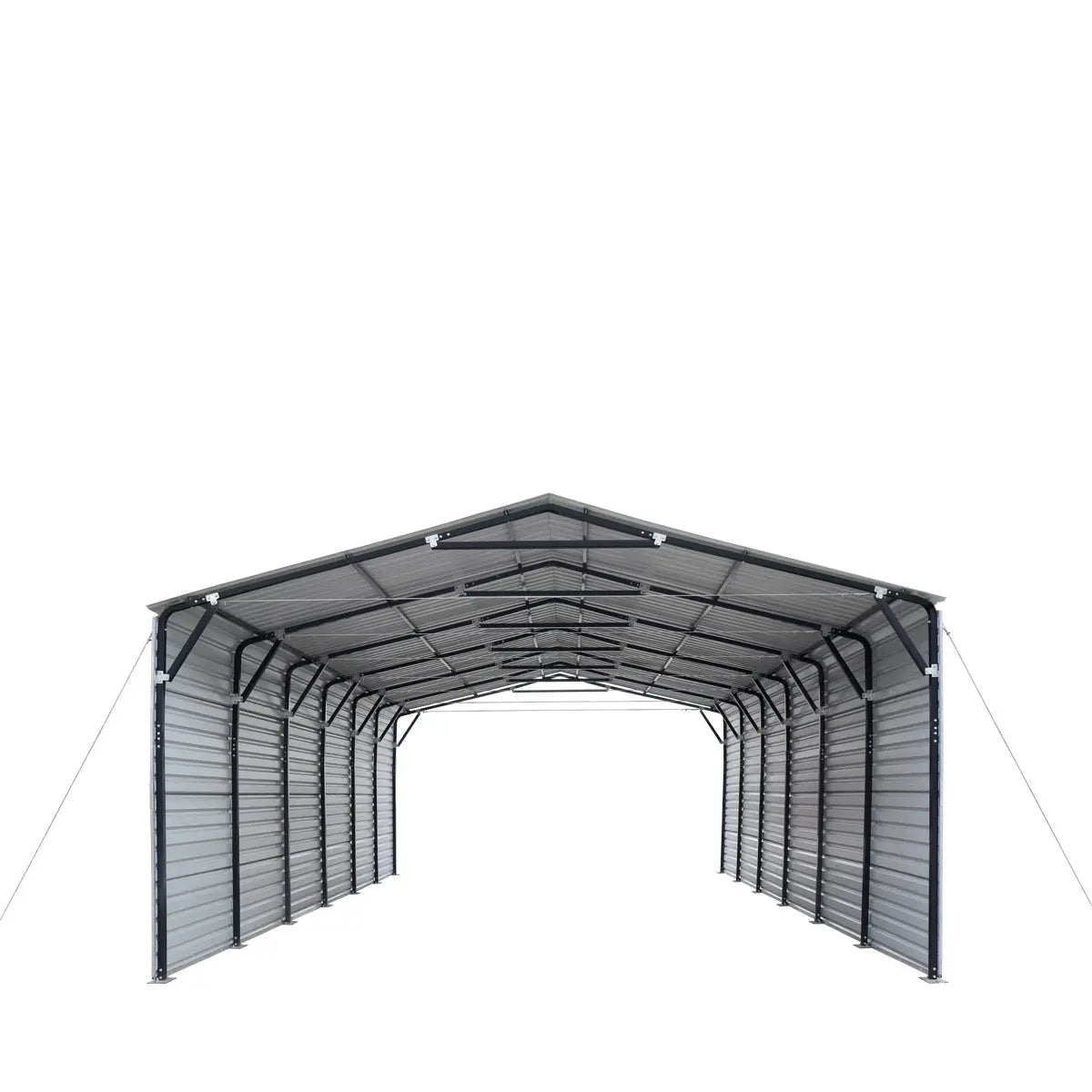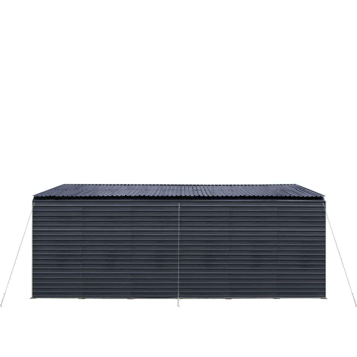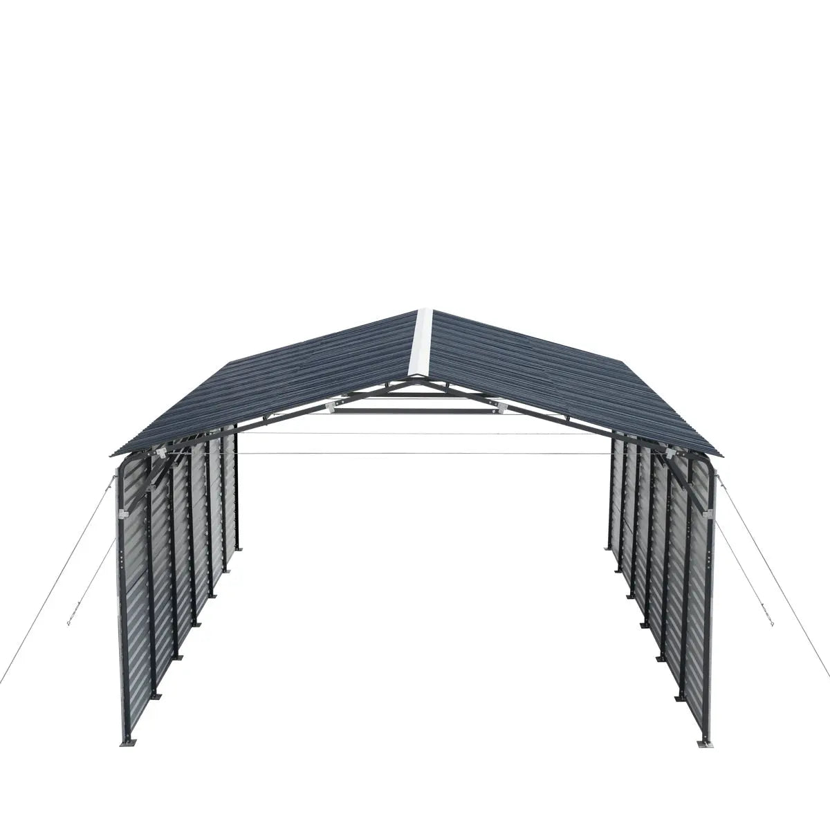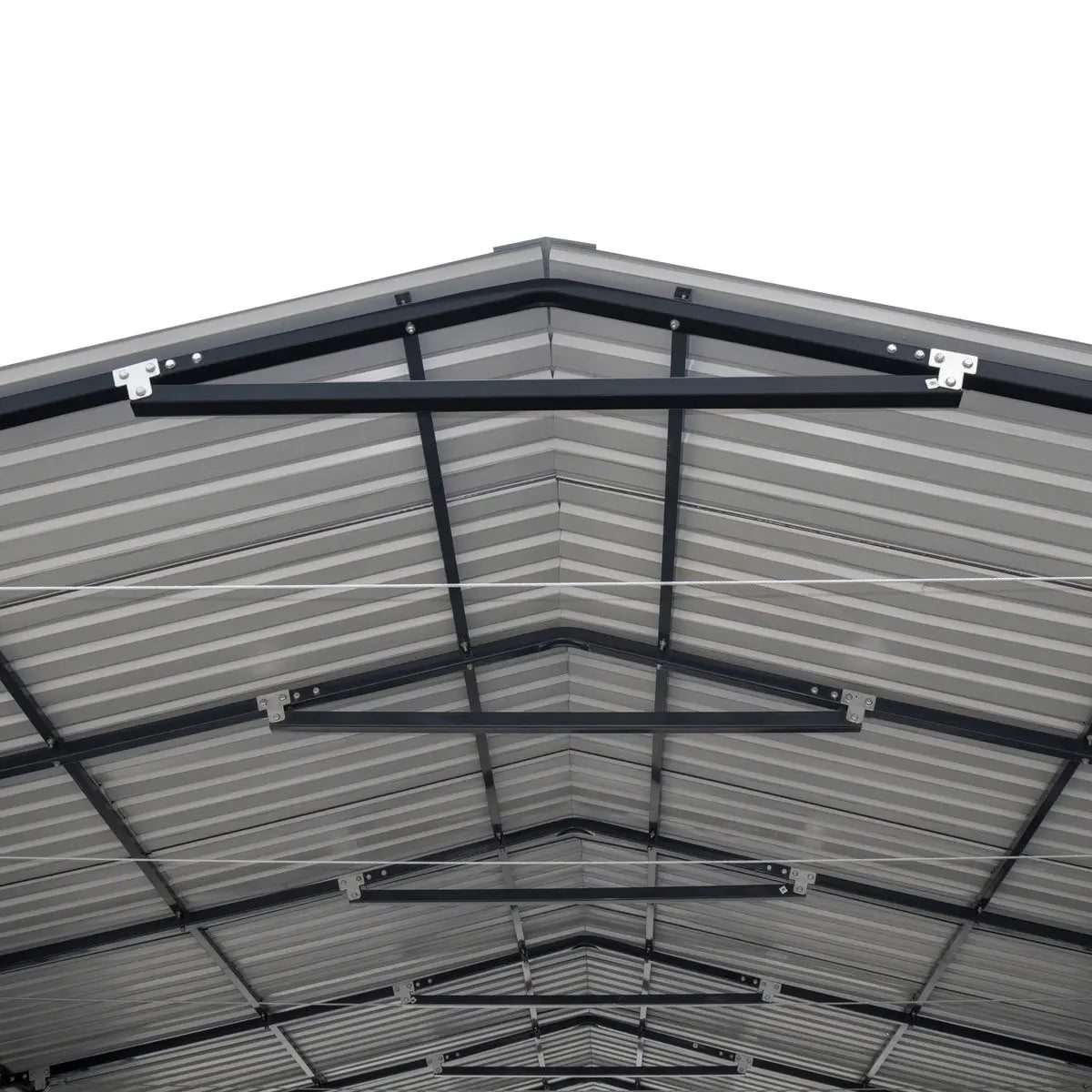 Over 1800 lb of heavy gauge galvanized metal with a powder coated finish protect this carport from the elements and make it highly resistant to rust, wear and corrosion. Robust metal roof and side panels have a surface polyester paint coating that provides another layer of protection which increases the lifespan and aesthetic quality. The vertical roof panels navigate moisture and help prevent snow buildup during the winter which decreases overall stress on the structure.