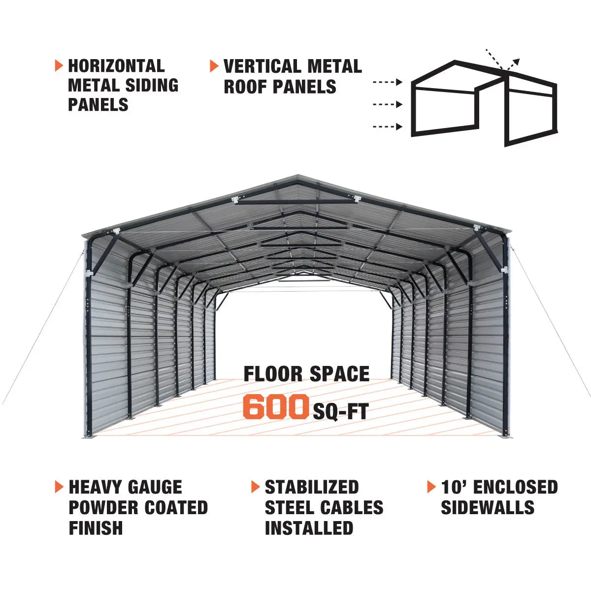 20’ x 30’ Metal Shed Carport, 10’ Enclosed Sidewalls, 600 Sq-Ft, 27 GA Corrugated Panels, TMG-MSC2030F