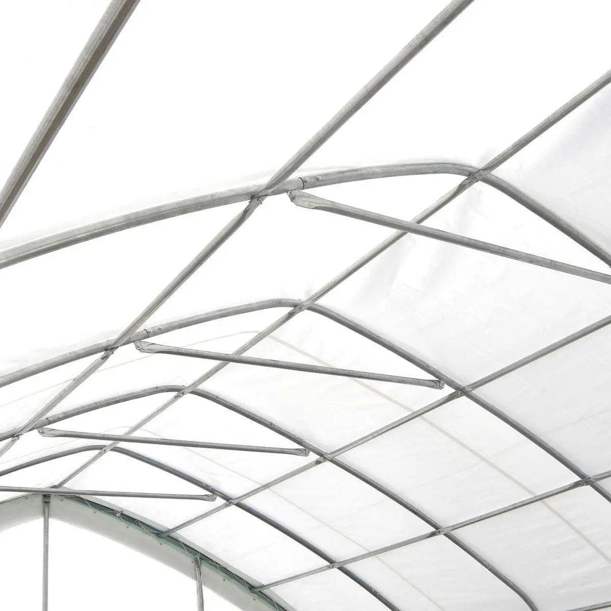 Made of strong, heavy-duty commercial grade polyvinyl chloride (PVC) fabric that is triple layered to prevent tearing and provide a long-lasting shelter covering for many years to come. This fabric is a natural flame retardant, commonly used in large commercial structures such as sports stadiums and event halls. The first 7 ft of each side is a straight wall which amplifies storage space along the edges. 54 roof purlins also run throughout the whole interior of the structure which reinforces it for exceptional durability and stability.