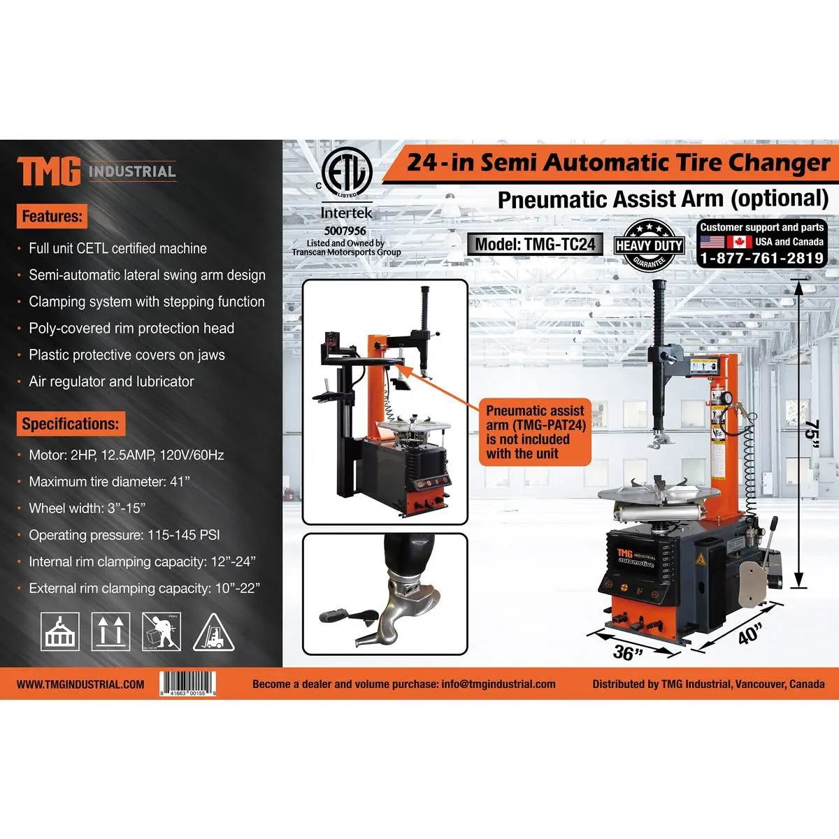 Semi-Automatic Tire Changer, 2 HP Motor, 12" - 24" Rim Clamping, CETL Certified TMG-TC24