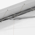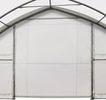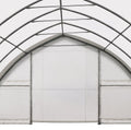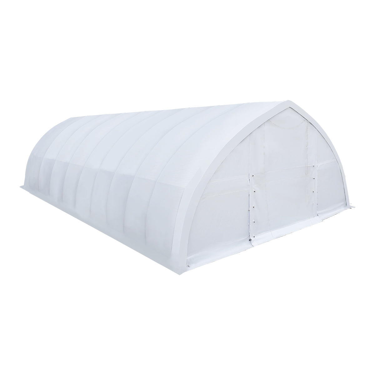 The structure features a commercial-grade, 3-layer galvanized steel frame with additional truss groups and tighter spacing to better handle snow and wind load. The cover is made from heavy-duty 17 oz PVC fabric that is UV-treated and flame-retardant. The white PVC fabric allows natural sunlight in, creating a brightly lit workspace while reflecting UV rays. Drive-through access is seamless, thanks to 12' wide x 11' high roll-up doors on both endwalls. The shelter's peaked roof and dirt skirts offer robust protection from all weather elements.