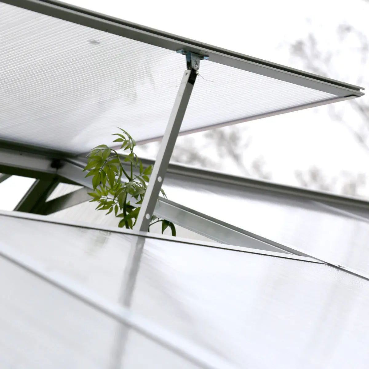 The TMG-GH820 Aluminum Frame Greenhouse is a sleek, professional growing structure for hobbyists and commercial growers alike. UV protected 4 mm twin wall polycarbonate panels protect your sprouts, seedlings and flowers from the elements while still allowing direct sunlight to diffuse through for warmth and optimal growing conditions. This greenhouse is built with a rust resistant and corrosion free aluminum frame and ground base bars for a strong, stable and long-lasting solution for healthy plant growth.