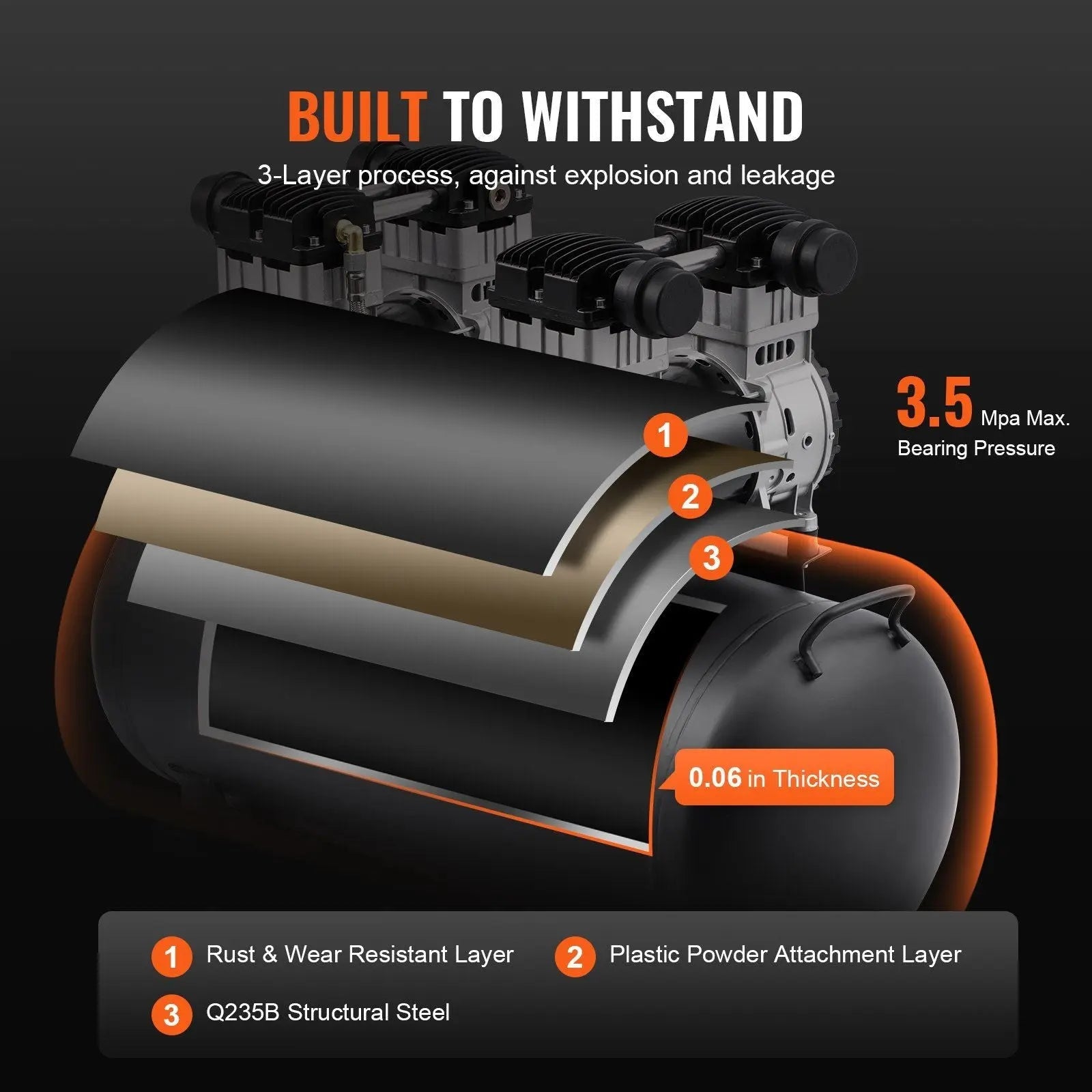 Built for durability, the DOBA-AC20L’s 20-gallon tank and frame are constructed using a three-layer process: a rust- and wear-resistant base layer, a plastic powder coating, and a Q235B structural-steel core to withstand high bearing pressure while preventing leaks and corrosion. Seamless welding ensures a robust, explosion-resistant structure. Whether you’re a contractor running nailers on-site, a mechanic inflating tires and powering impact wrenches, or a woodworker using spray guns and pneumatic tools, this compressor combines quiet operation, advanced safety protections, and rugged construction to meet demanding workshop and job-site needs.