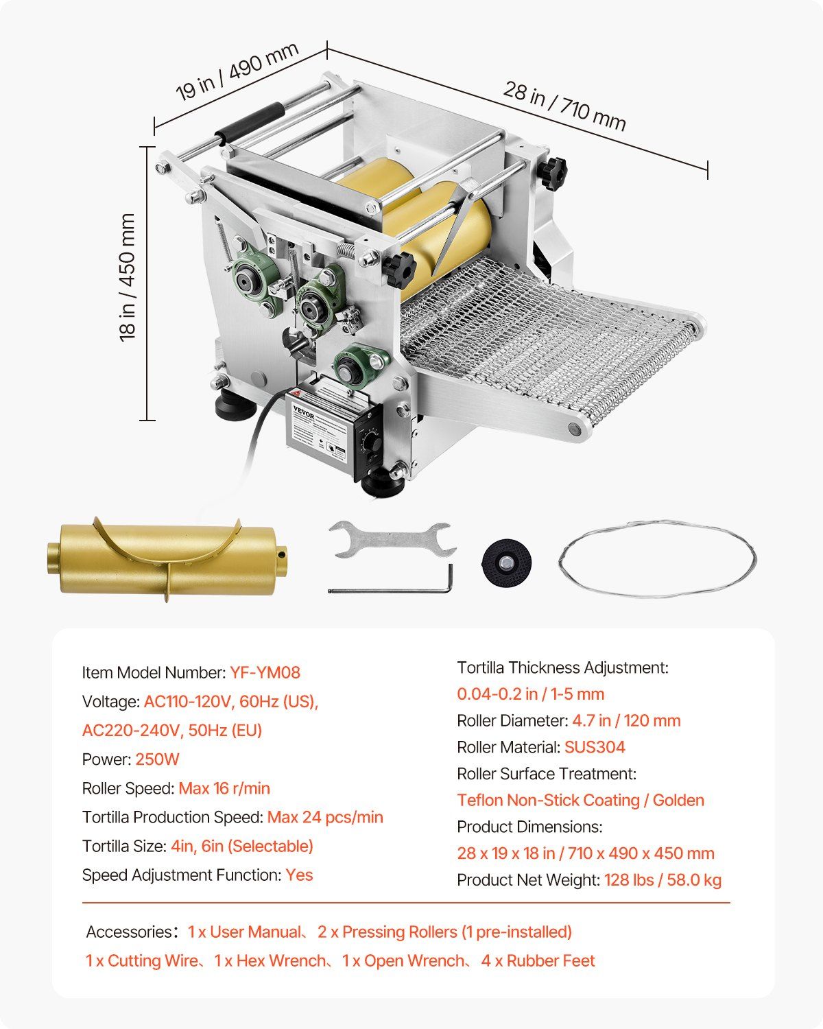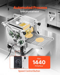 This automatic electric tortilla maker simplifies the process with its user-friendly design—just place the dough into the top roller entrance, and it can press up to 1,400 tortillas per hour, saving time and labor. The adjustable knob allows you to customize thickness between 1 and 5 mm, while the included 4-inch and 6-inch roller molds offer flexibility for different tortilla sizes. Its food-grade non-stick rollers and conveyor system prevent dough from sticking, ensuring smooth release and effortless cleaning. Built for durability, the stainless steel rollers and corrosion-resistant structure provide long-lasting performance and hygiene. Versatile in use, it’s perfect not only for tortillas but also for preparing Sopes, Gorditas, Roti, Pita, and Tortilla Pizza—ideal for food trucks, fast-food outlets, cafeterias, and home kitchens.