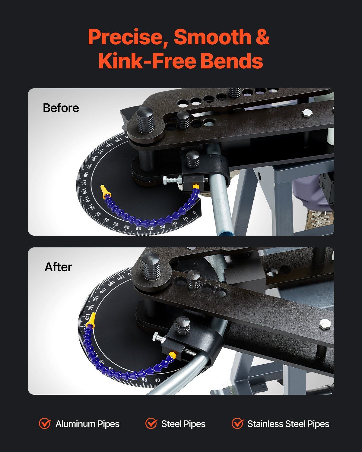 Efficient Pipes Bending: Our 1HP/750W powerful electric bending machine is capable of bending pipes with a maximum thickness of up to 5mm, suitable for steel, aluminum pipes ranging from 3/4 to 2 inch. (Maximum Bending Angle: 180°)