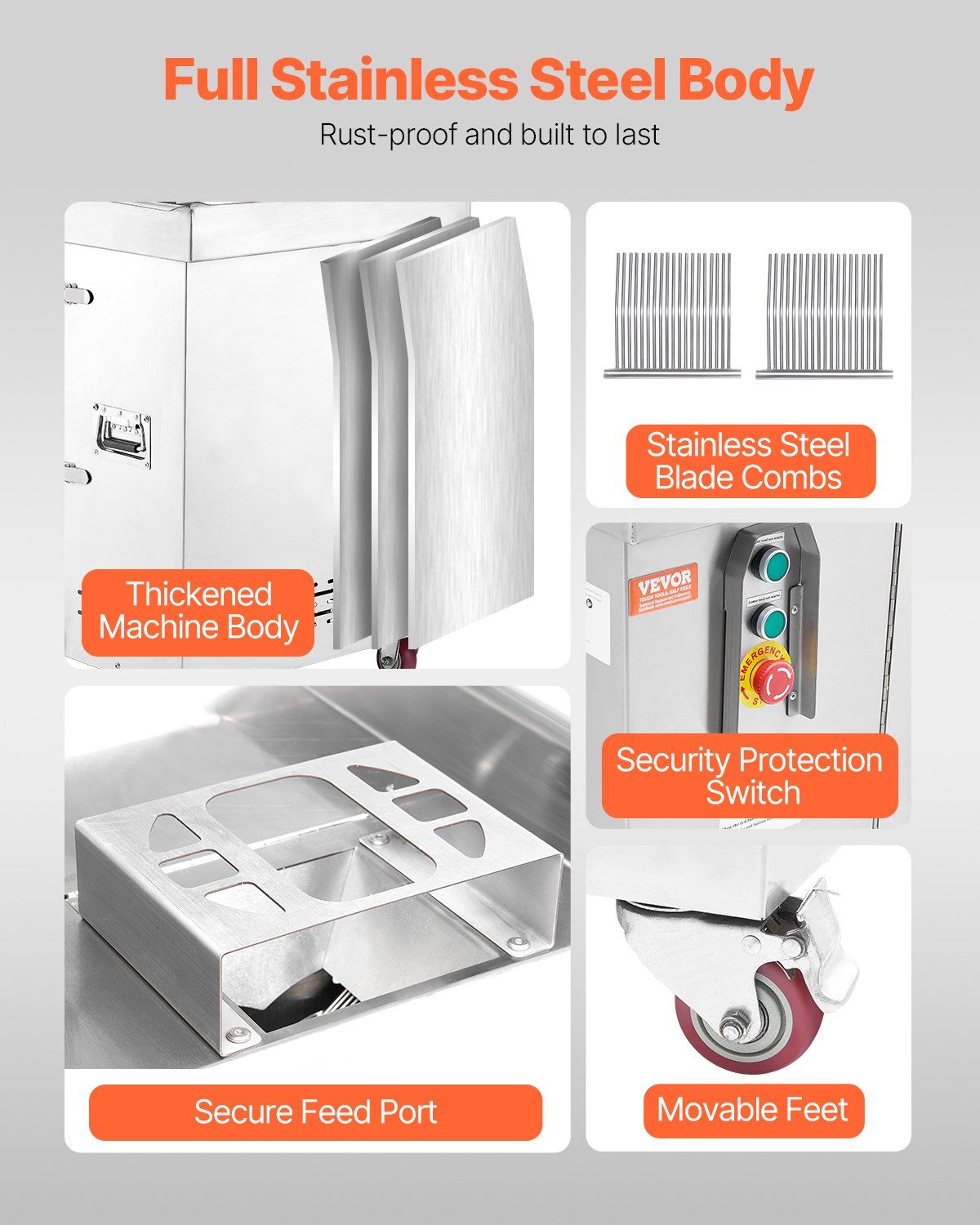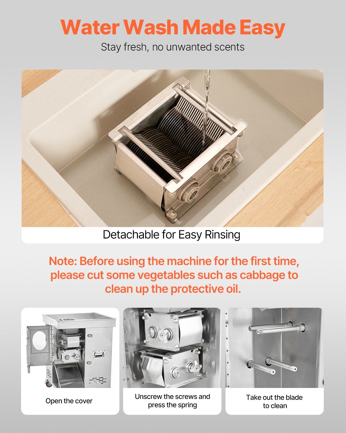 This commercial meat cutter machine features a widened, enlarged feed port for safety and convenience, ideal for slicing boneless meats such as pork, beef, lamb, and fish, as well as soft vegetables like cabbage and mushrooms. It’s not suitable for bone-in meats, frozen foods, or hard vegetables. The detachable stainless steel blade set includes sharp Φ105 mm blades with a 5 mm slice thickness for fast, precise cuts and easy cleaning. Powered by a robust 1100W motor operating at 1780 rpm, it can process up to 1102 lb of meat per hour efficiently and quietly, thanks to its combination of durable metal gears and low-noise nylon gears. The blades come pre-coated with rust-proof oil—simply slice some vegetables before first use to remove the residue. Built with high-quality stainless steel, the machine offers excellent rust resistance and stability, with an anti-slip rubber base that keeps it securely in place, making it perfect for restaurants, butcher shops, farmer’s markets, and home kitchens.
