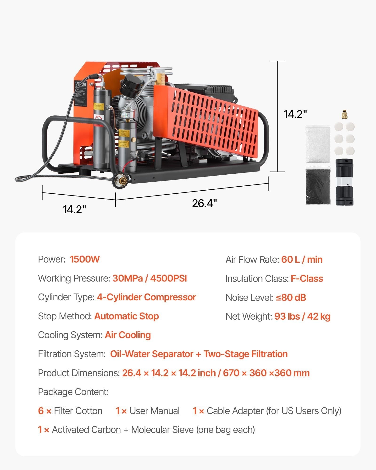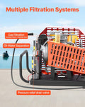 This PCP air compressor features a four-cylinder, four-stage compression system delivering up to 4500 PSI (30 MPa) with 1500W of power and a high airflow rate of 60 L/min. It can fill a 6.8 L tank from 0 to 4500 PSI in about 35 minutes and a 12 L tank from 0 to 2900 PSI in around 40 minutes. Its multi-layer filtration system—combining an oil-water separator with activated carbon and molecular sieve filters—effectively removes moisture, oil, and impurities to produce clean, dry, high-quality air. A large cooling fan ensures efficient heat dissipation and prevents overheating, enhancing both safety and equipment lifespan. The built-in pressure gauge provides real-time readings, and the automatic stop function halts operation once the preset pressure is reached to prevent over-pressurization. Versatile and reliable, this compressor is suitable for scuba diving, PCP air rifles, paintball, firefighting, leak detection, and air-tightness testing. (Note: Use EC750 food-grade lubricating oil.)