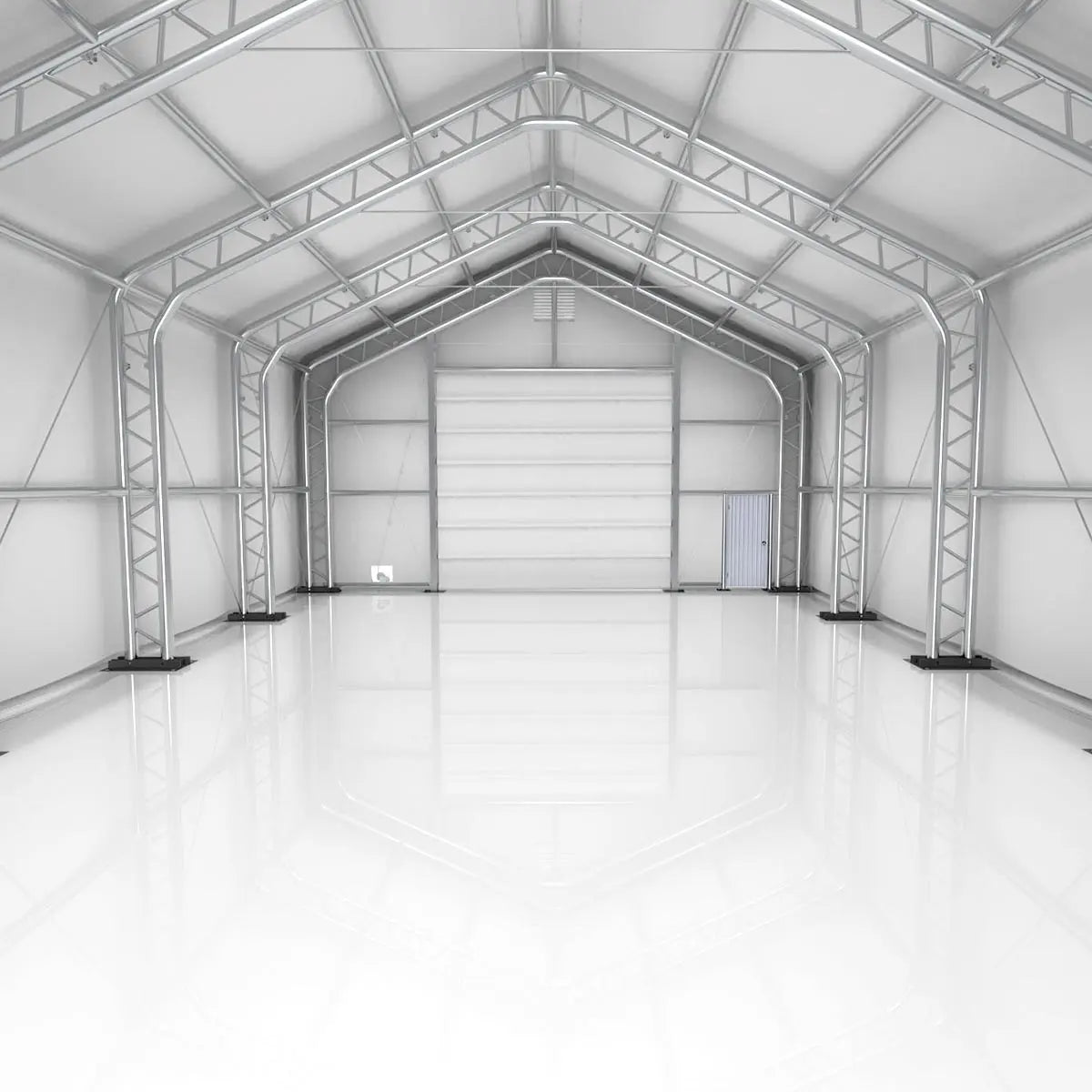Made of strong, heavy-duty commercial grade polyvinyl chloride (PVC) fabric that is triple layered to prevent tearing and provide a long-lasting shelter covering for many years to come. This fabric is a natural flame retardant, commonly used in large commercial structures such as sports stadiums and event halls. The first 12 ft of each side is a straight wall which amplifies storage space along the edges. Double trusses with a reduced 8' truss spacing reinforce the entire DT Pro Series and give them all exceptional durability and stability.