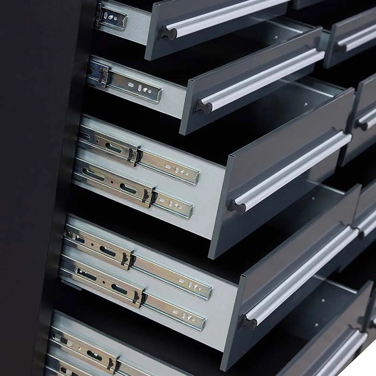 Powder-coated for extra durability and equipped with smooth-gliding ball bearing rails, this workbench is designed for professionals who value quality, function, and mobility. Built for professionals who demand strength and reliability, this workbench is perfect for garages, workshops, and industrial spaces.