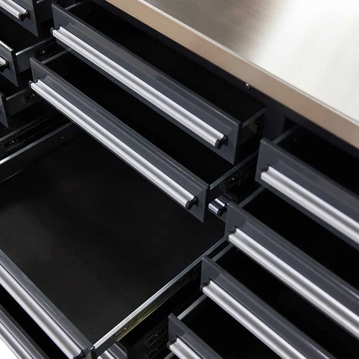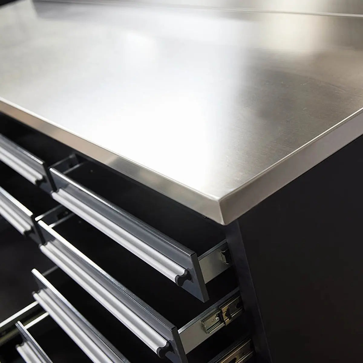 Its all-steel welded frame and 1.5mm stainless steel work surface offer industrial-grade strength, while the 4" back lip ensures a tidy workspace. With a mix of skinny, medium, wide, and large drawers rated for up to 400 lbs, you'll have tailored storage space for your every need.