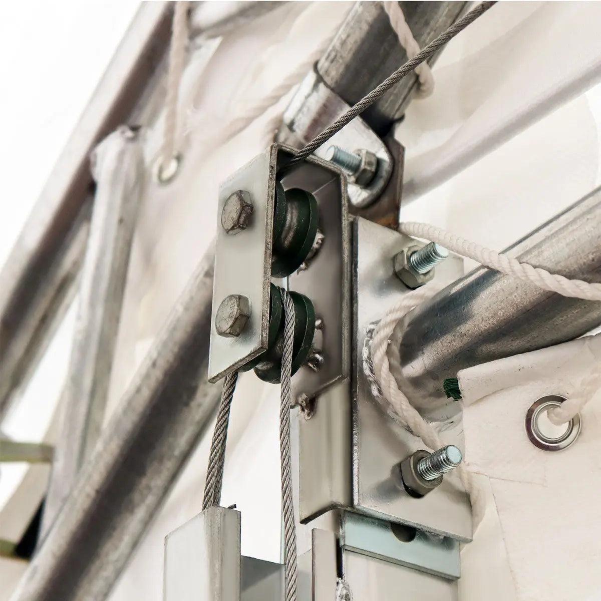 Roughly 12' wide winch roll-up doors on both end walls provide a huge opening to allow workflow coming in and out. The steel man door provides a convenient, house like entry that is more secure than standard fabric cut out openings. Our PVC fabric comes in a vibrant white color that reflects UV rays but allows light to permeate through. This natural illuminating quality will help you save on utility costs and provide all day use even when it's cloudy.
