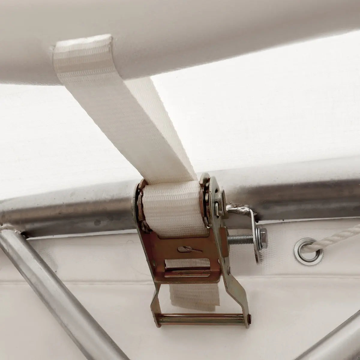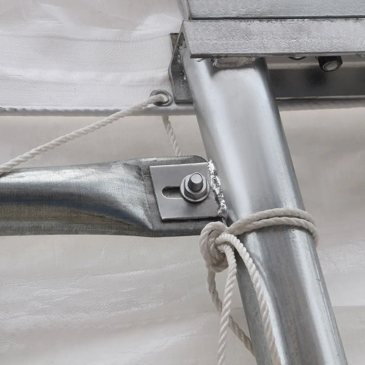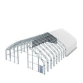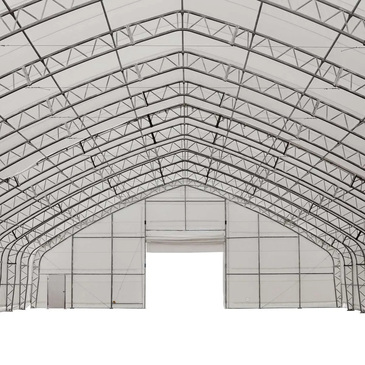 Made of strong, heavy-duty commercial grade polyvinyl chloride (PVC) fabric that is triple layered to prevent tearing and provide a long-lasting shelter covering for many years to come. This fabric is a natural flame retardant, commonly used in large commercial structures such as sports stadiums and event halls. The first 12 ft of each side is a straight wall which amplifies storage space along the edges. Double trusses with a reduced 6' truss spacing reinforce the entire DT Pro Series and give them all exceptional durability and stability.