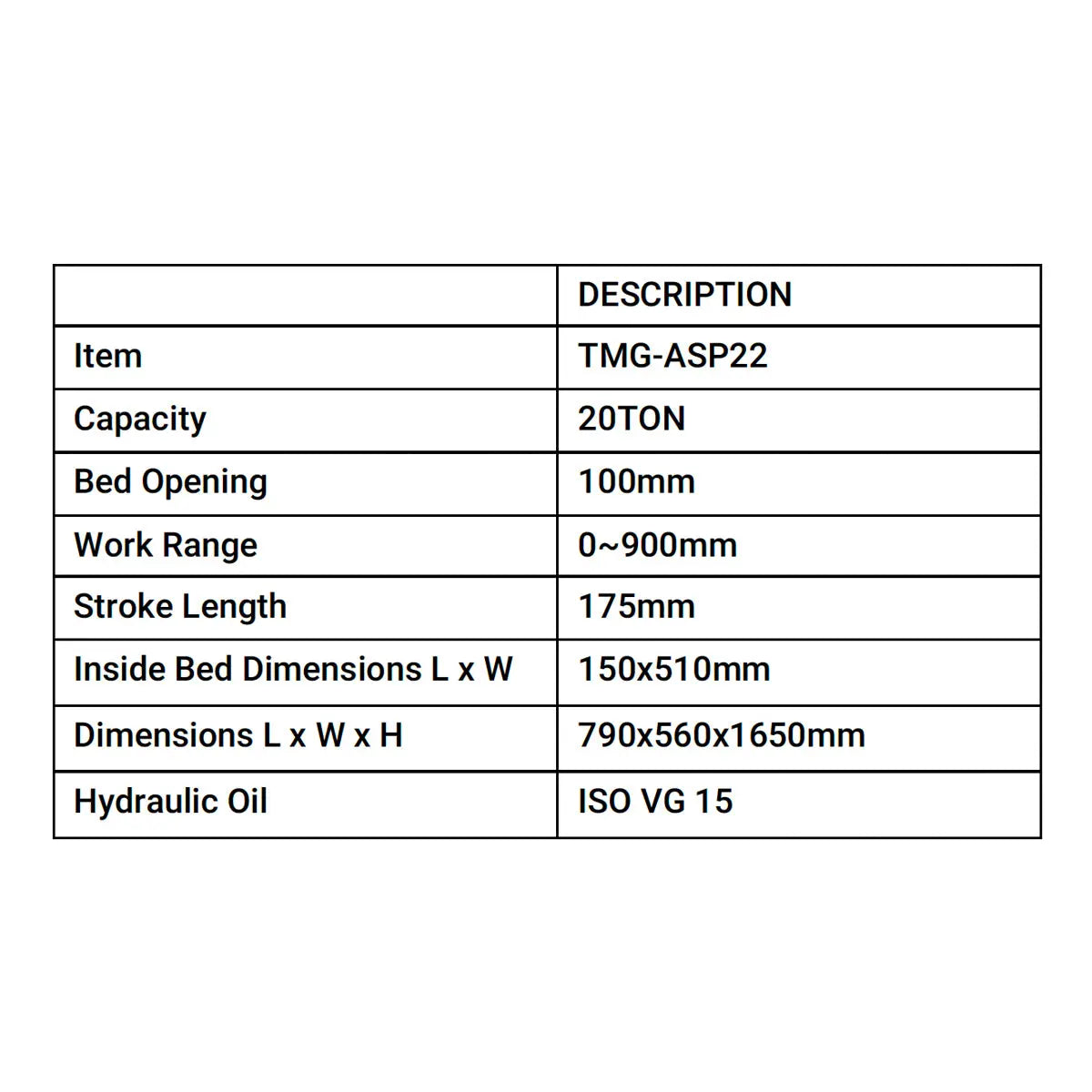 The TMG-ASP22 Hydraulic Shop Press is an essential piece of equipment for any type of automotive shop, machining, metalworks, fabrication or assembly operations. 20 tons of pressing capacity and a heavy-duty H-frame makes pushing bearings onto shafts, stamp work, bending or flattening metal safe, efficient and easy to do.