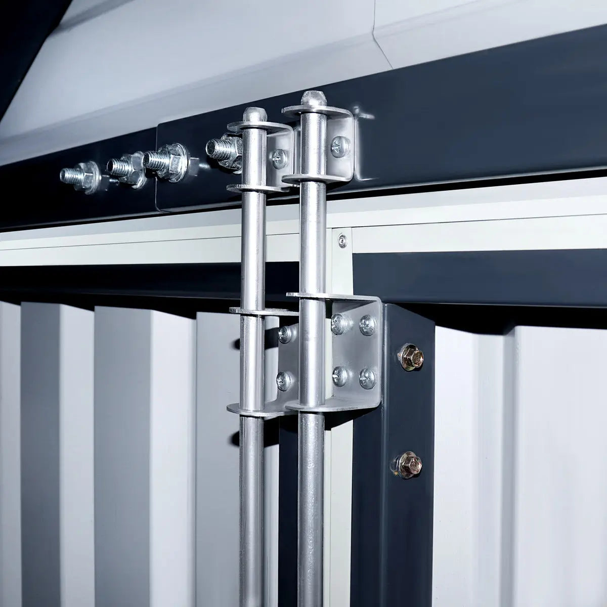 A sloped gable roof to help prevent snow and water build up on those cloudy winter days. Slip-fit base frame with sleeve anchor bolts installation makes this structure easy to install on any solid wood platform or concrete slab. Immediately increase the value of your property by adding to it this metal shed which is only a fraction of the cost compared to building a similarly sized structure.