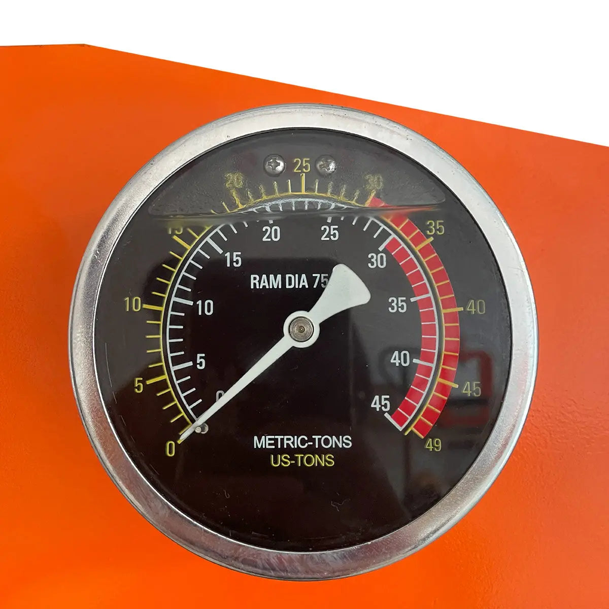 The oil filled pressure gauge can be read in US and metric tons, and allows you to accurately monitor your pressing force while operating. Made to handle tough jobs like gear and bushing removal. Ships free from our warehouses in Richmond, BC and Mississauga, ON with a one year manufacturer warranty.