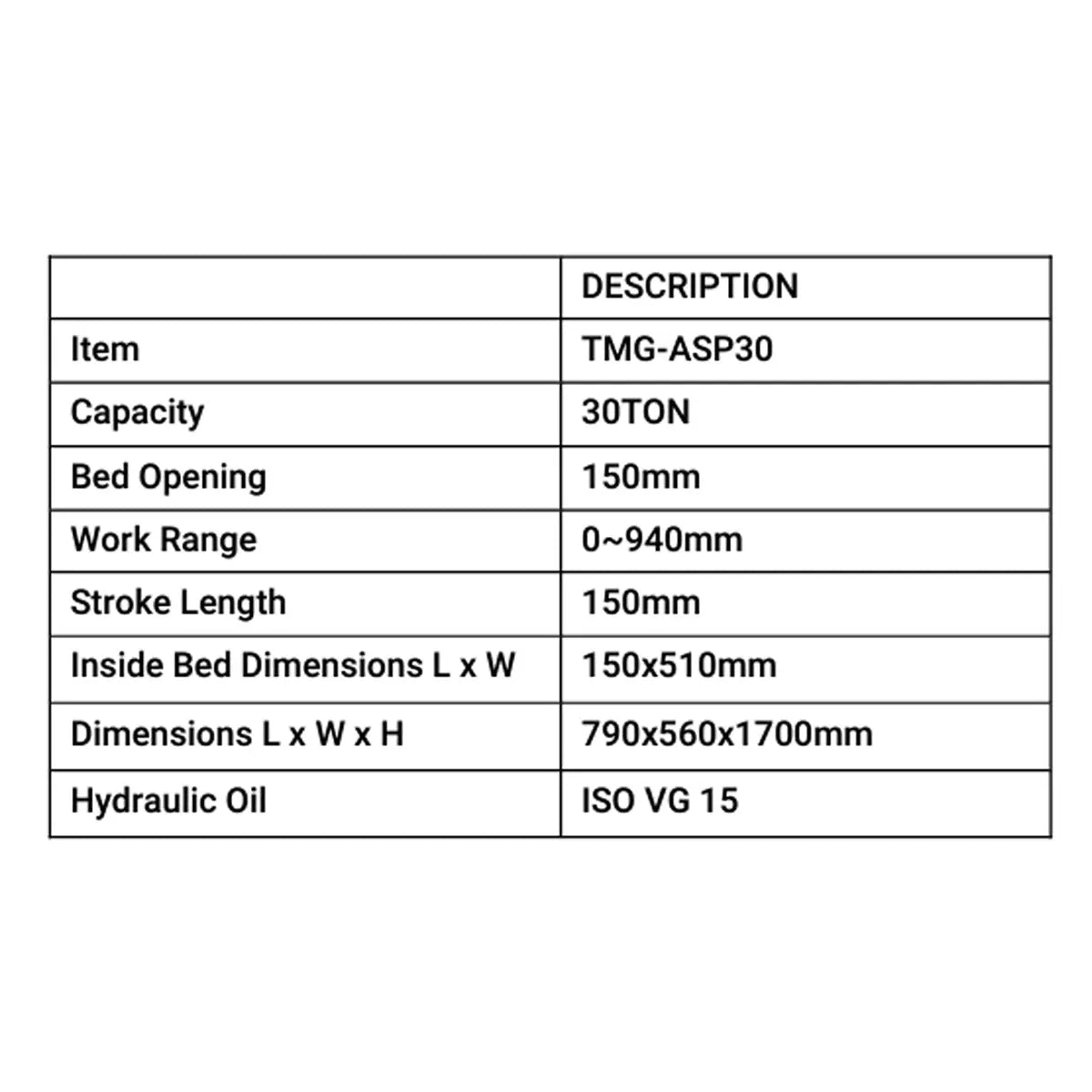 30 Ton Capacity Hydraulic Shop Press, Pneumatic & Manual Operation, 11 Bed Height Positions, TMG-ASP30