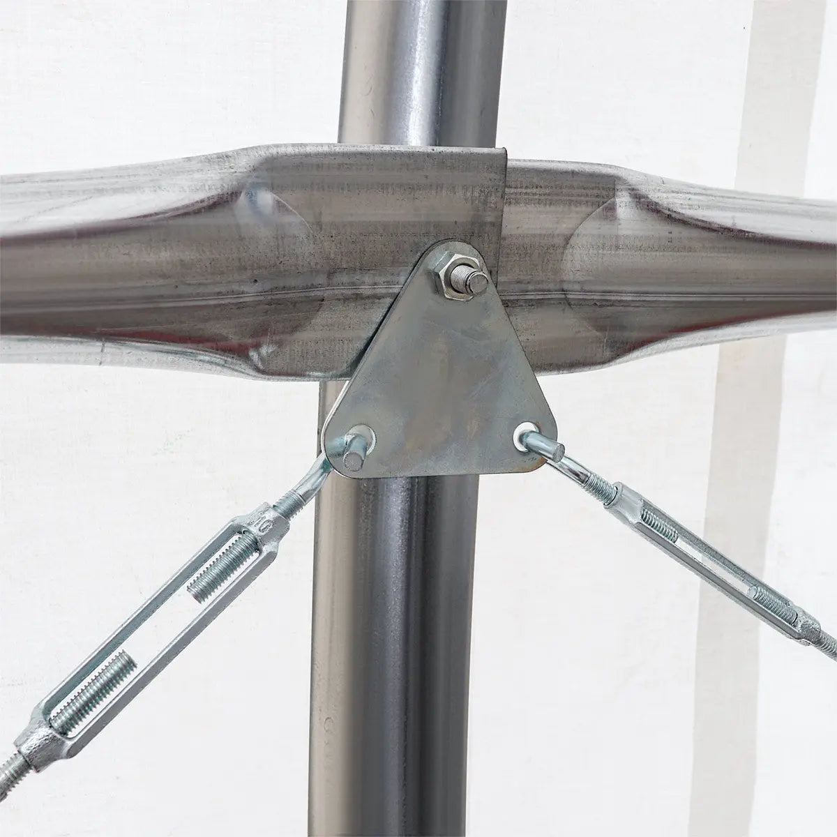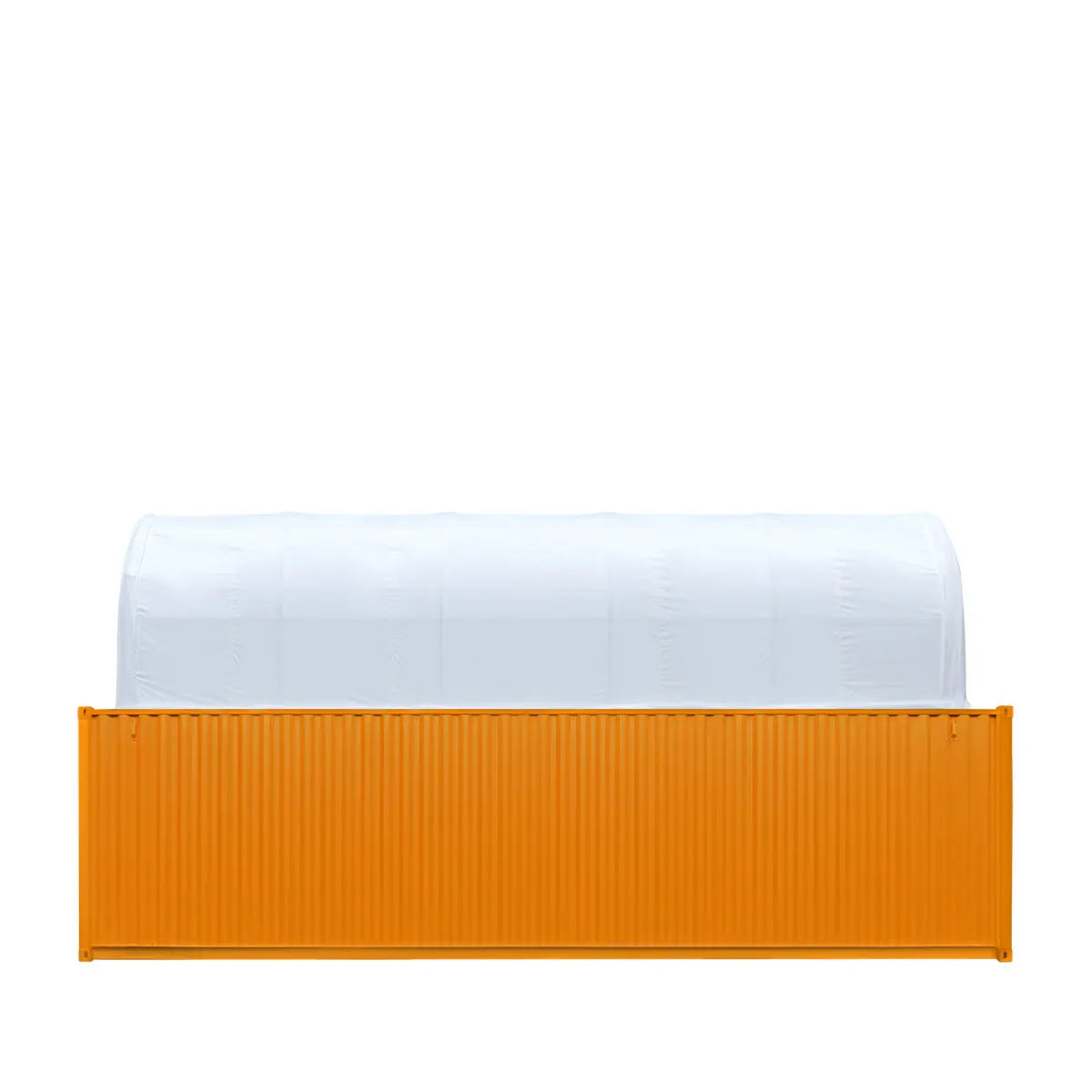 Roughly 30' of entry and exit space on both end walls provides a huge opening to allow workflow coming in and out. This structure is designed for installation on the outer or inner edges of your containers. For harsh weather areas or places with insufficient space, it's recommended to use the outer edges of the container (so it is fully enclosed) to prevent snow buildup outside the structure.
