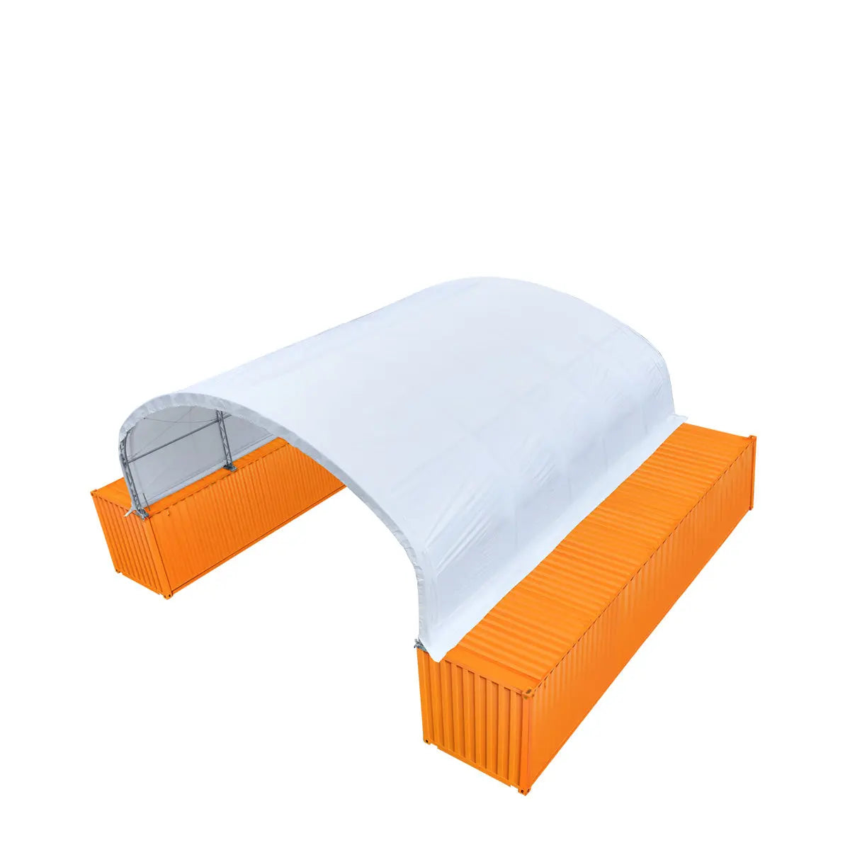 The TMG-DT3040C Dual Truss PVC Fabric Container Storage Shelter provides an easy to assemble, durable outdoor storage solution or workshop for your farm, construction site, equipment dealership and more. Approximately 600 square feet of covered space to stockpile materials, work on projects, park vehicles and accommodate all other needs big or small. Able to install on any standard containers for versatile usability whether you're working in remote, rural or industrial locations.