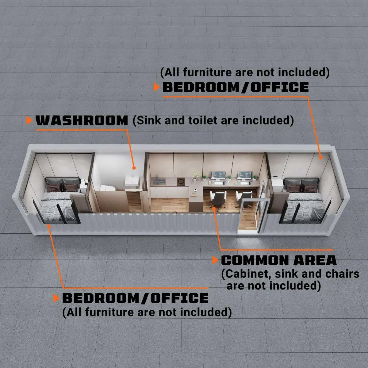This office comes equipped with pre-wired outlets, switches, and power in each room, ensuring convenience and ease of use. The bathroom includes a toilet, washer-basin, and ventilator, while the two bedrooms offer ample space for king or double beds. These models are exempt from planning permission, and can be built in the place that best suits your convenience.