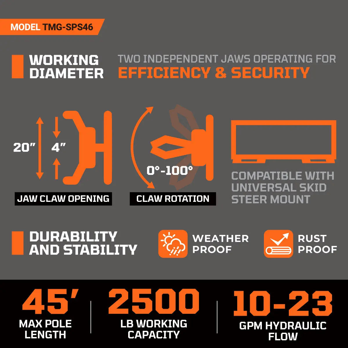 2500-lb Skid Steer Pole Setter, 45' Pole Capacity, 0°-100° Claw Rotation, Jaw Claw Opening 4" to 20", TMG-SPS46