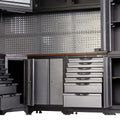 The TMG-WBM15 Extreme-Duty Steel Garage Corner Tool Chest is a versatile, commercial strength tool storage and work surface solution for your home garage, repair shop, automotive business or any other industrial setting. Seven cabinets and 21 lockable sliding drawers of varying sizes provide maximum storage possibilities, and a beech wood finished work surface for long term smooth workflow that is resistant to scratches, impact and wear.