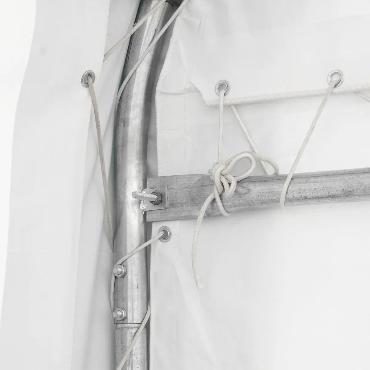 Made of strong, heavy-duty commercial grade polyvinyl chloride (PVC) fabric that is triple layered to prevent tearing and provide a long-lasting shelter covering for many years to come. This fabric is a natural flame retardant, commonly used in large commercial structures such as sports stadiums and event halls. The first 7 ft of each side is a straight wall which amplifies storage space along the edges. 72 roof purlins also run throughout the whole interior of the structure which reinforces it for exceptional durability and stability.