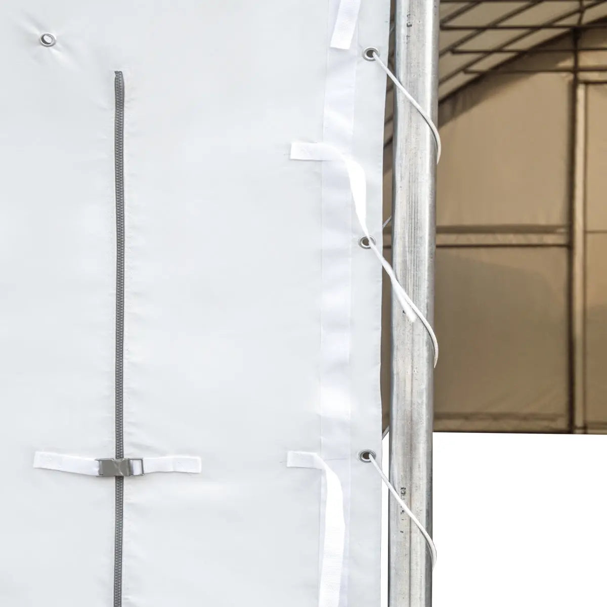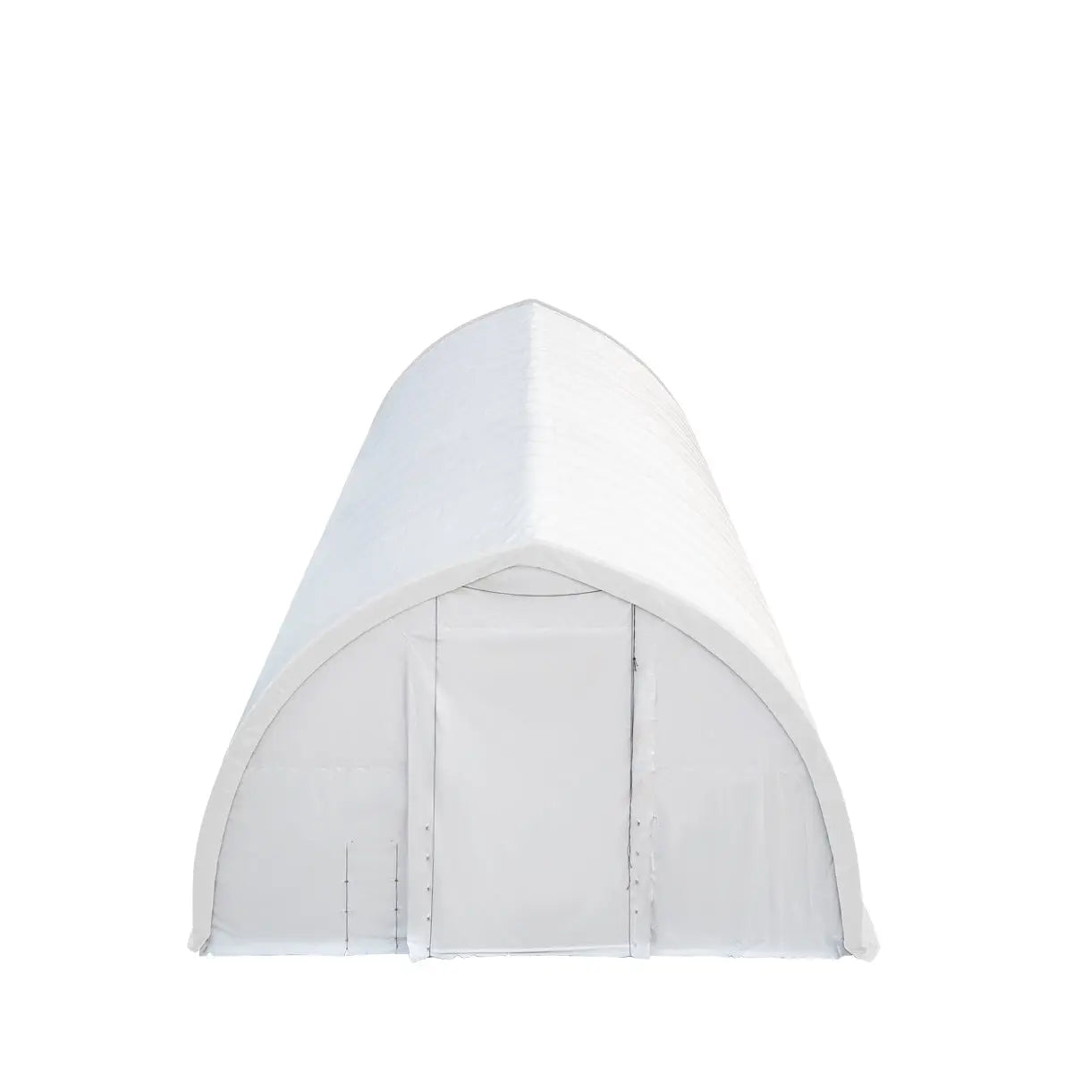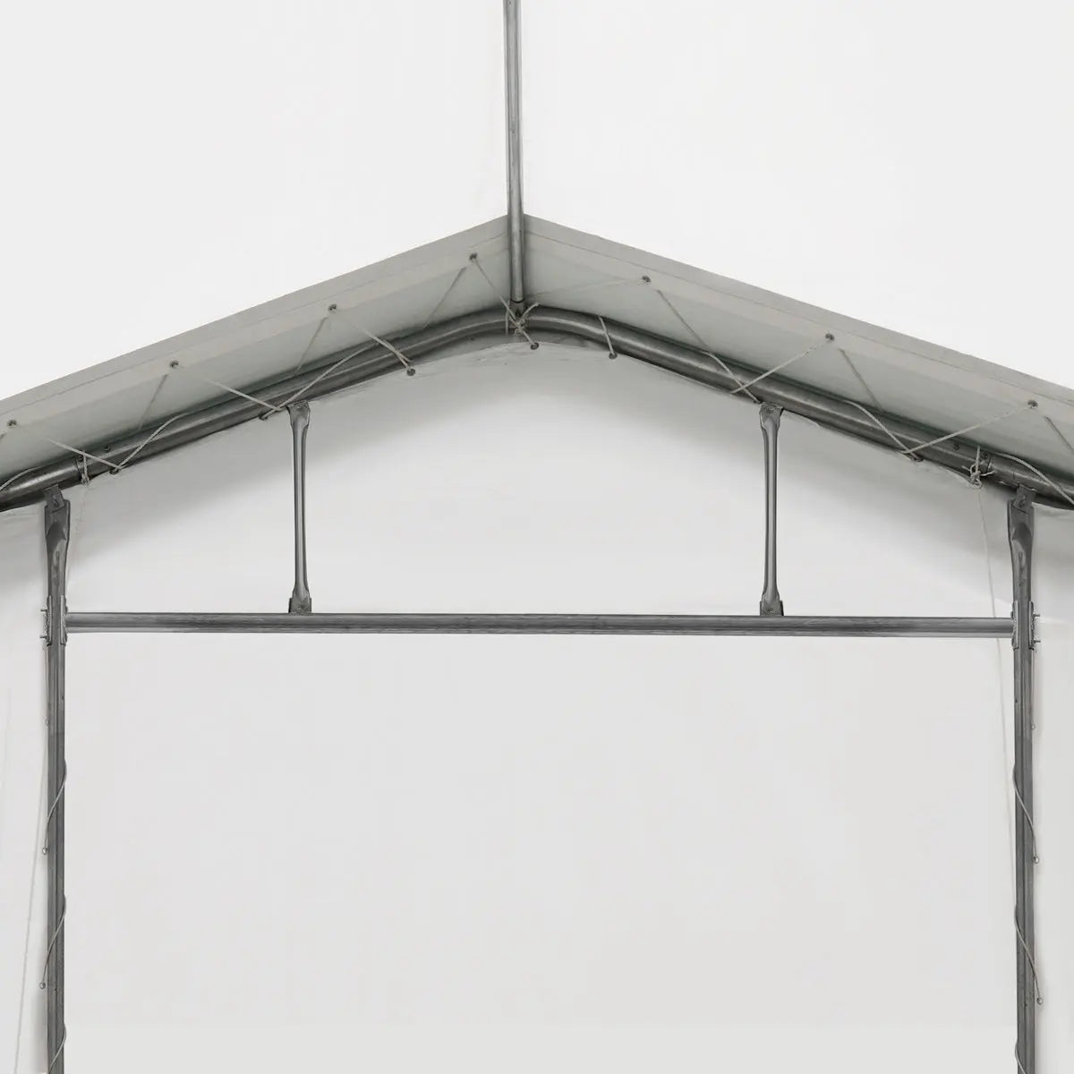The TMG Industrial 40 x 80 ft Peak Ceiling Storage Shelter features a heavy-duty 17 oz PVC fabric cover that is treated to be fire retardant, UV resistant, and water-resistant. The peak style structure is made of commercial-grade galvanized steel tubes that are designed to be long-lasting and relatively easy to assemble. A dirt skirt along both long sides helps protect against crosswinds, giving this shelter increased durability. Both ends feature a door with an opening 13 ft wide by 16 ft high. This shelter is great for cars, SUVs, boats, and ATVs, as a small shop, for storing farm equipment, and much more.