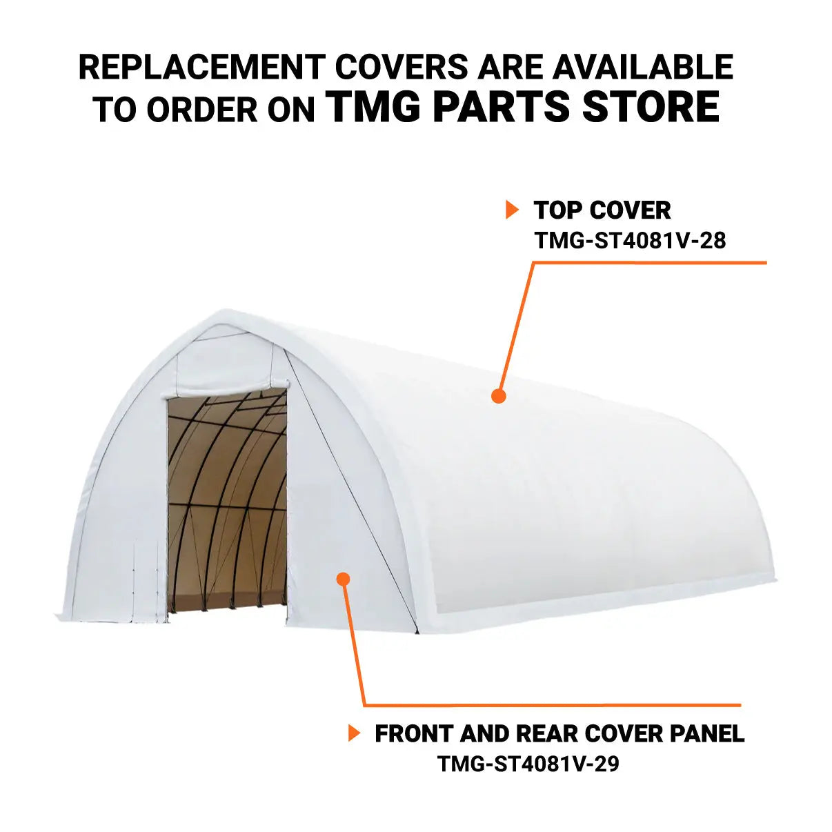 TMG-ST4081V 40' x 80' Peak Ceiling Storage Shelter, Single Truss, 17oz Commercial Grade PVC Cover, 13' Wx 16' H Wide Open Door on Two End Walls