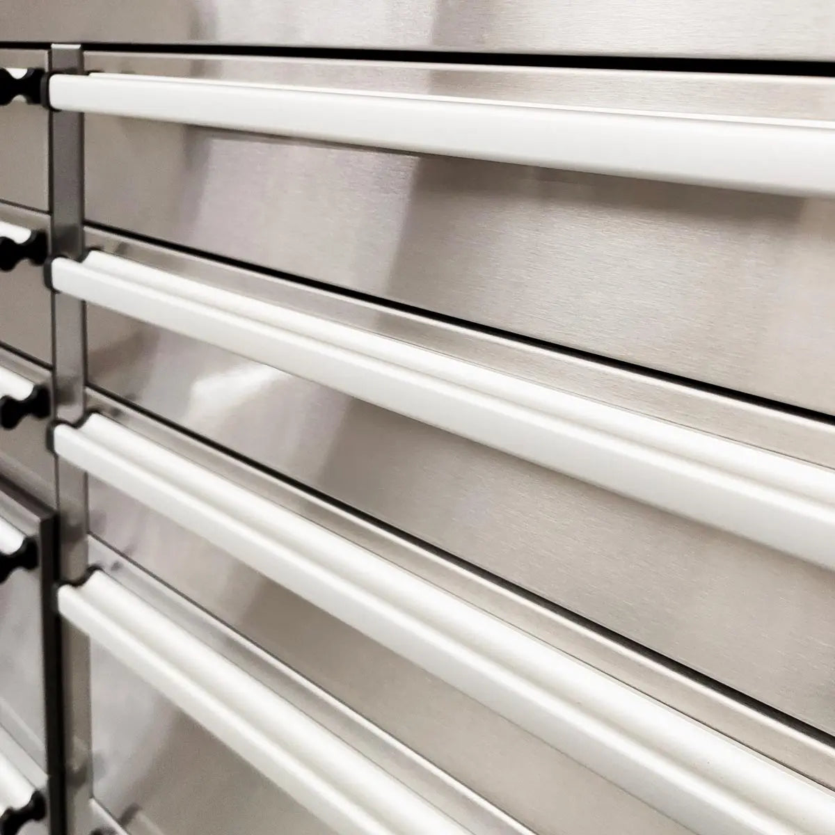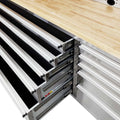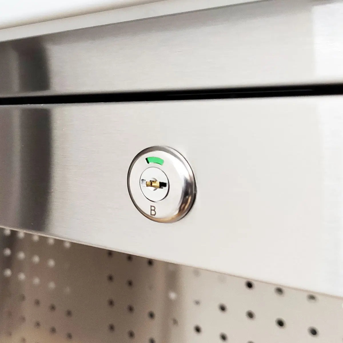 This bench features 15 heavy-duty lockable sliding drawers and top mounted storage cabinets with adjustable shelving. The security and mobility of this workbench make it incredibly adaptable to any kind of professional work environment and is built to last with a powder coated finish.