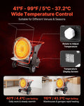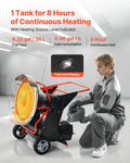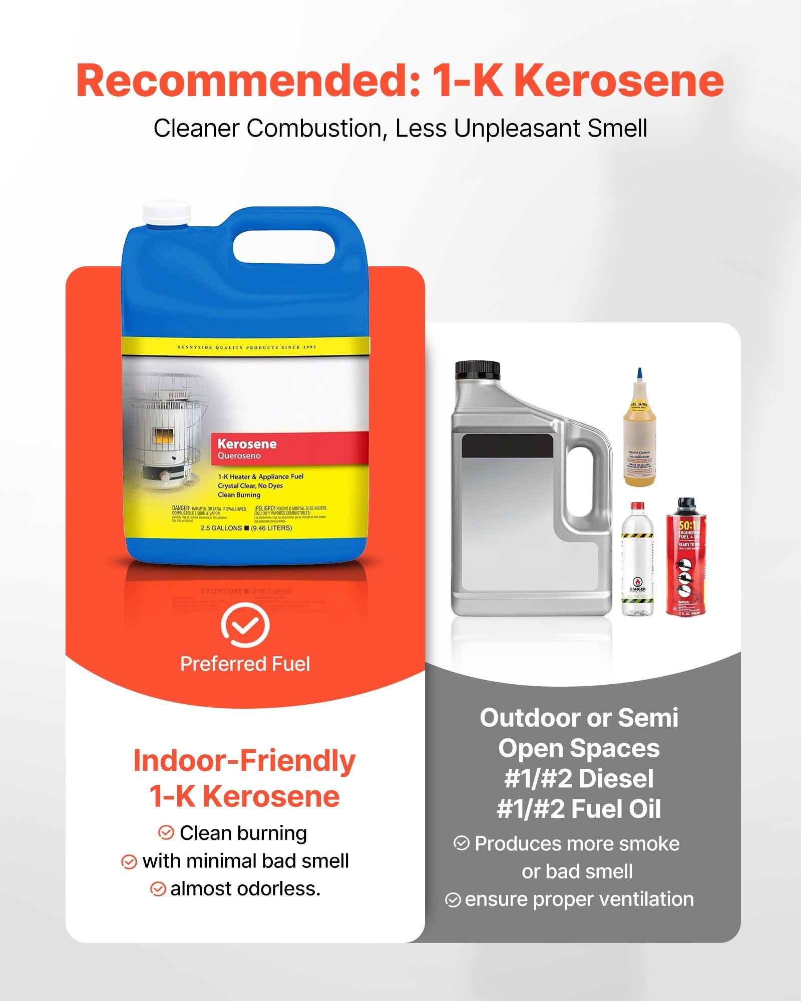 This kerosene forced air heater delivers rapid, even heat for large indoor spaces of 320–420 m², producing 125,000 BTU of output and operating at a low noise level of 70 dB. The adjustable thermostat allows precise temperature control from 41°F to 99°F (5°C–37.2°C) using an easy-to-read digital display and rotary knob, ensuring consistent warmth without overheating. Equipped with a 9.25-gallon (35 L) fuel tank, it runs continuously for up to 10 hours while consuming only 0.96 gallons per hour for efficient operation. For best results, use 1-K kerosene to achieve cleaner combustion, minimal odor, and improved reliability. Designed for convenience, this portable heater features durable bottom wheels for easy movement, letting one person effortlessly transport it wherever heat is needed.