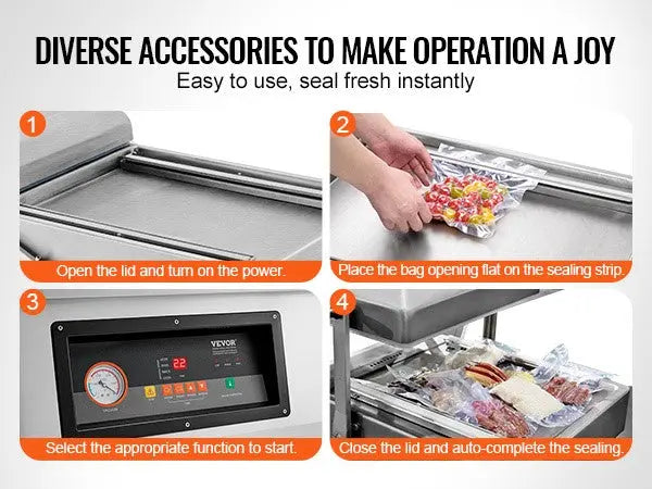 DOBA-VS23 is designed to preserve food, medicines, and other perishable items with precision and efficiency. With a powerful 4510W motor and a maximum vacuum of -100KPa, this commercial-grade vacuum sealer ensures reliable, airtight sealing. Featuring a large 600mm sealing length, adjustable cooling time, and multiple sealing bars, it provides excellent sealing performance for bags of all sizes, making it ideal for restaurants, home kitchens, and food packaging.